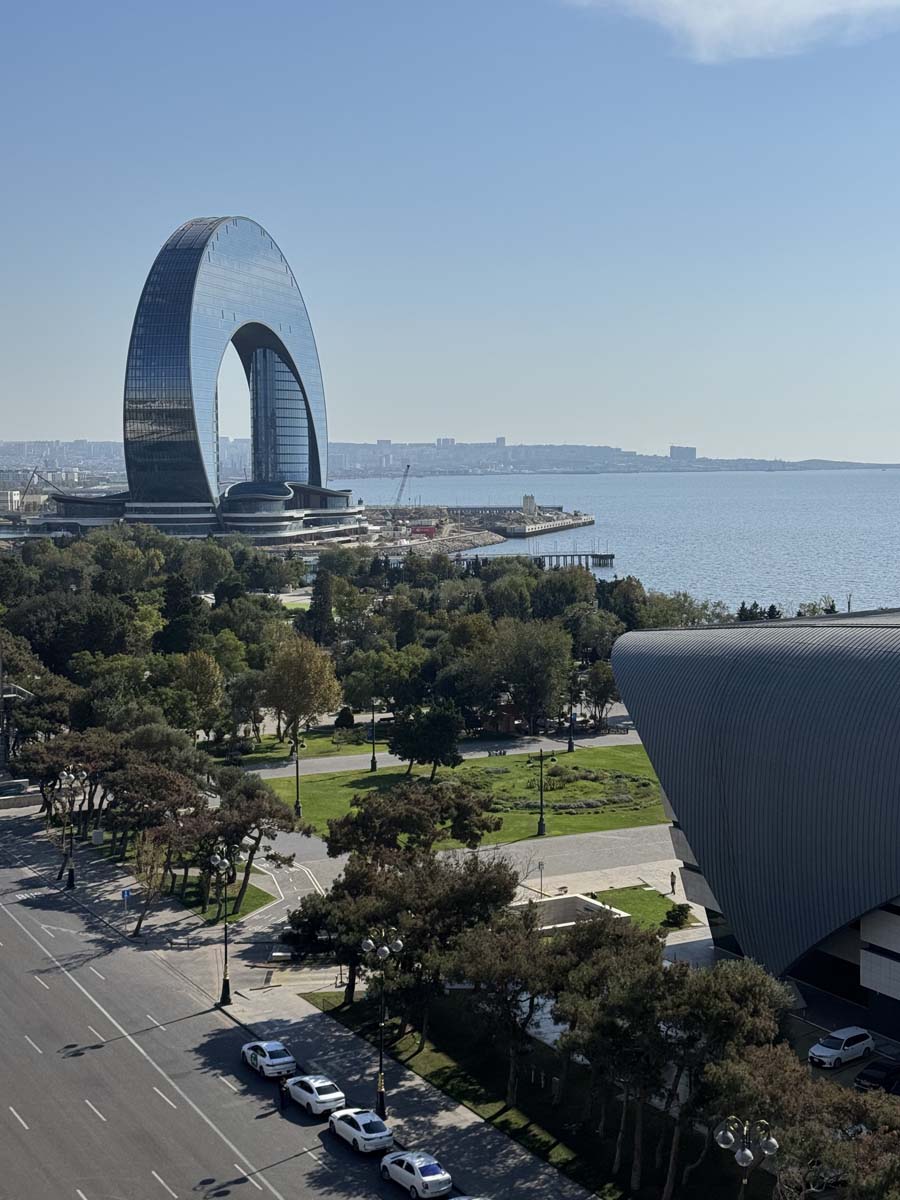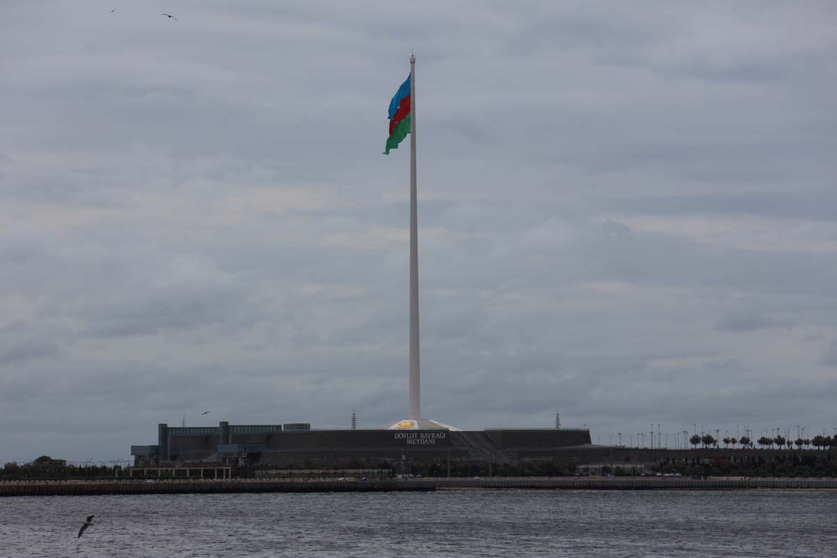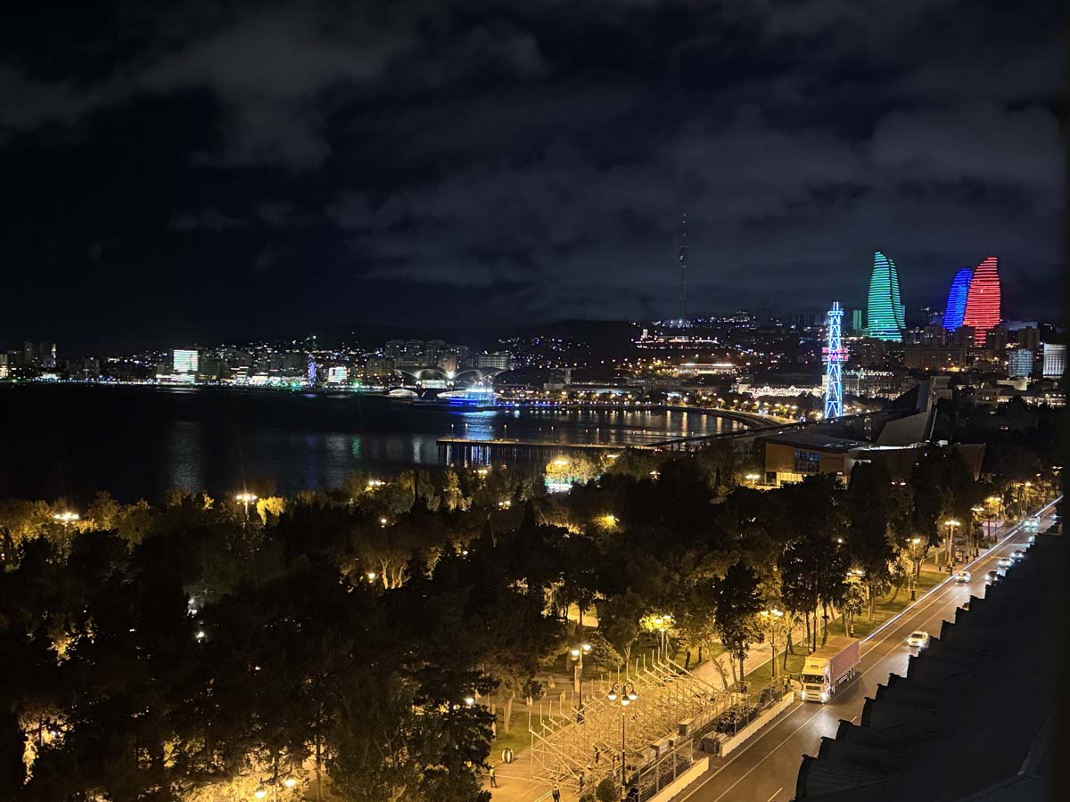 Ikkunastamme aukesivat mahtavat näkymät niin pilvenpiirtäjille, kuin Kaspianmeren ja rantabulevardin suuntaan. Katseemme kiinnittyi valtavaan Azerbaidžanin lippuun, joka liehui lahden toisella reunalla.