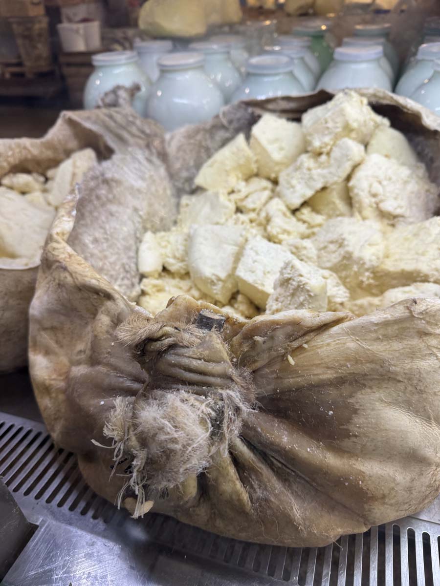 Meidän huomiomme kiinnitti kuitenkin lampaannahkaan valmistettu juusto, jonka tyrmäävän vivahteikkaasta mausta Ilkka pääsi nauttimaan keväisellä Georgian matkalla. Juuston omaleimaisen aromin taustalla piilee se, että nahkapussissa karvat ovat sisäpuolella.