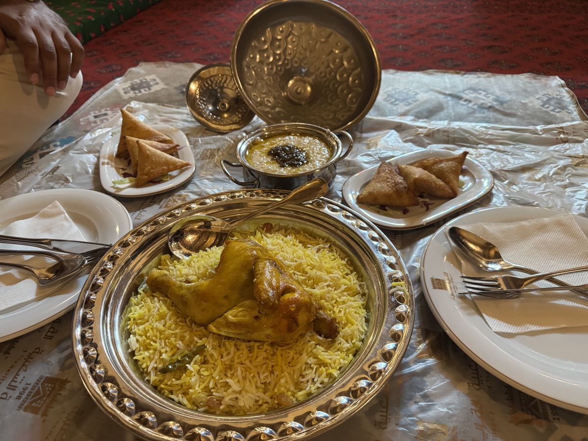 Ohjelmaan sisältyi perinnelounas, jossa saimme valita istummeko lattialla vai pöydän äärellä. Valitsimme lattiaruokailun, sillä se oli meille uusi kokemus. Oppaamme ruokaili kanssamme ja meille katettiin matolle asetetun suojan päälle kauniissa astioissa kanaa riisipedillä, puuroa sipulihillolla ja samosoja. Lisukkeena oli chilikastiketta.