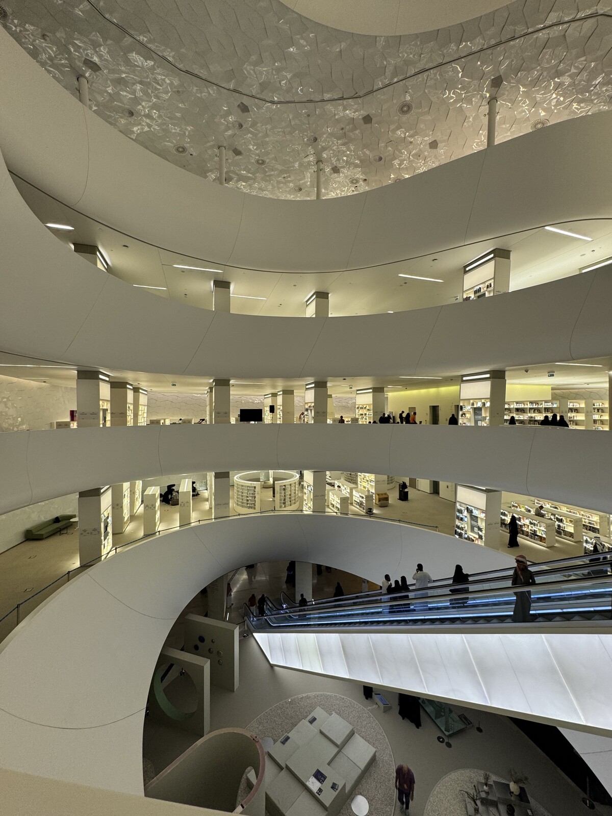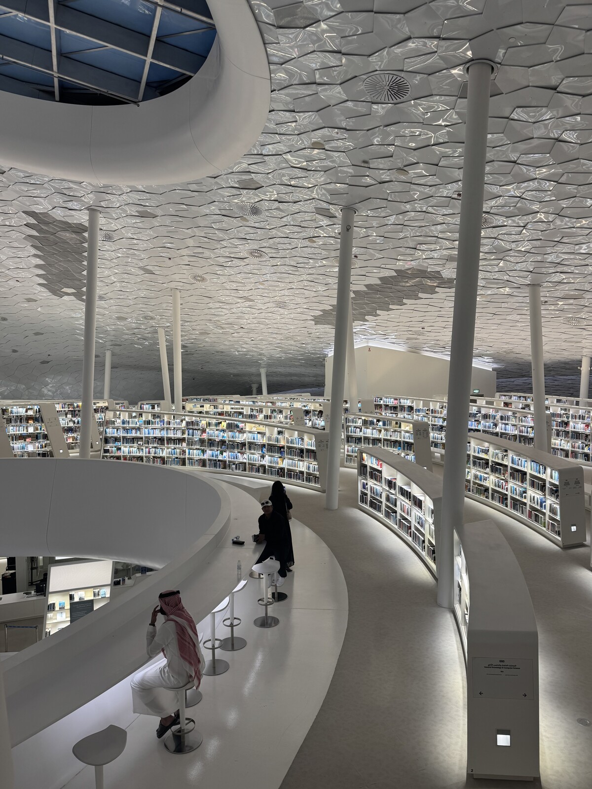 Rakennuksen sisällä on tyylikäs valkoinen kirjasto, jota kannattaa ehdottomasti käydä ihailemassa ylimmästä kerroksesta saakka.