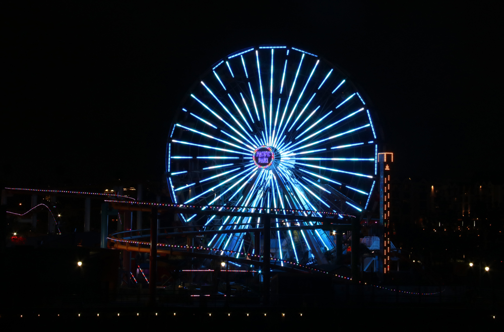 Järkkärikuvauksen opettelu on loputon tie, jonka alkuvaiheessa tarpoville (eli meille) tämä yön hämärtyessä otettu kuva on suuri työvoitto. Santa Monica -laiturin päästä löytyy ravintolarakennus, jonka yläkertaan pääsi tuulensuojaan ja siellä oli myös rauhallista ottaa kuvia. Tukevana jalustana toimi terassin kaide ja ainakin 20 otosta vaadittiin, että saatiin edes jonkinlainen tyydyttävä kuva värikkäänä vilkkuvasta ja jatkuvasti liikkeessä olleesta maailmanpyörästä.