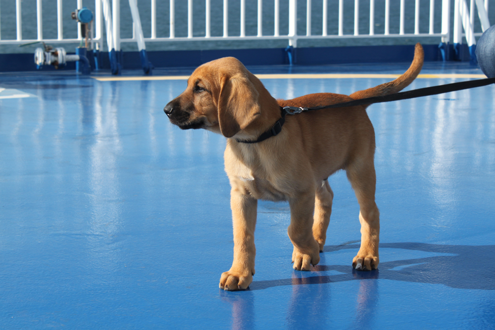 Suuri haaveemme toteutui, kun saimme broholminkoira Pluton Tanskasta. Tässä kuvassa paluumatka on jo voiton puolella ja ihmettelemme maailman menoa Saksan Travemündesta Helsinkiin kulkevan lautan kannella. Vaiherikkaan hakumatkan käänteistä löytyy myös pidempi blogiteksti.