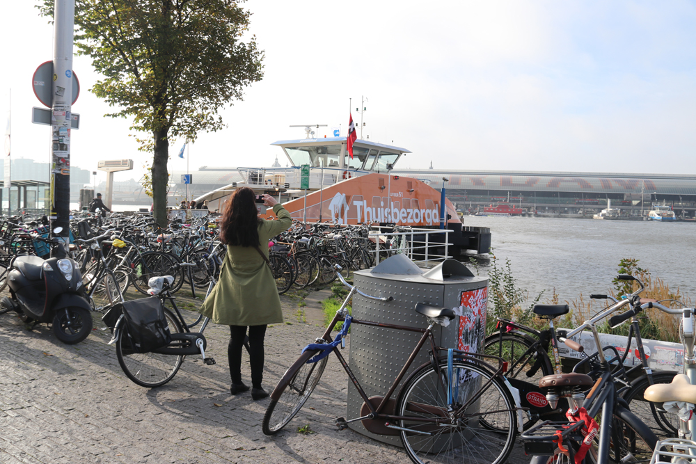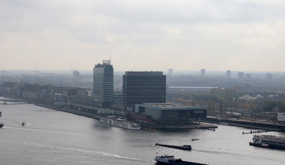 Vietimme Amsterdamissa pidennetyn viikonlopun torstaista sunnuntaihin, joten otimme heti perjantaiaamuna suunnan tähän kohteeseen välttääksemme viikonloput jonot. Tämä oli hyvä ratkaisu, sillä paikalla oli vain kourallinen ihmisiä. A’DAM Lookout sijaitsee Central Stationia vastapäätä ja paikan päälle pääsee helpoiten ilmaisella lautalla tai metrolla (kertamaksu 2,90 tai kolmen päivän lippu 17 euroa – hinnat 10/2017). Lauttoja lähtee kolmeen eri kohteeseen, joten kannattaa valita se, joka ajaa opasteiden mukaan näyttävään valkoiseen rakennukseen, Eye Film Instituteen. Nämä kohteet sijaitsevat vierekkäin.