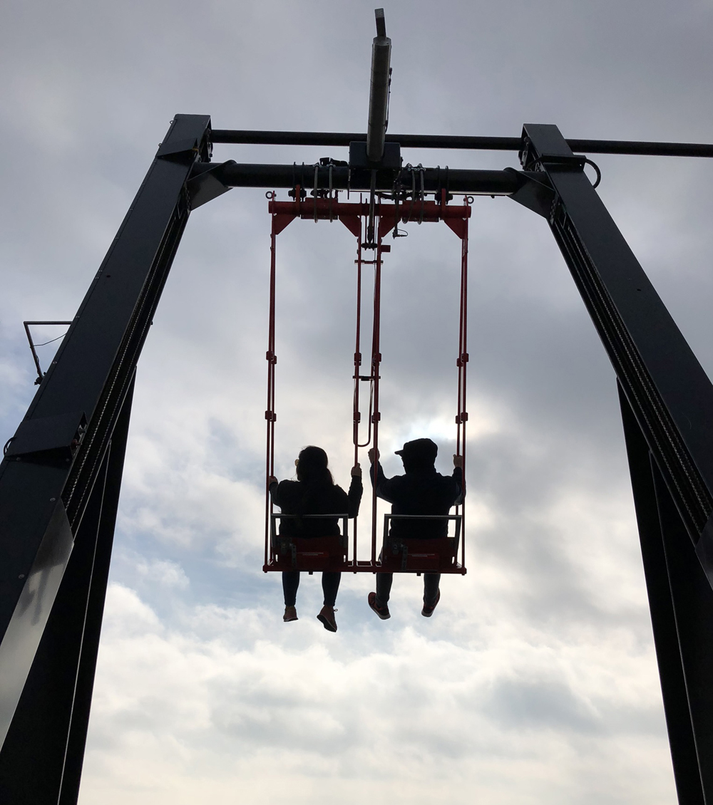 Meidän vuoromme koitti pian. Ilman suurempia ohjeistuksia jätimme reppumme säilytyskoriin ja istuimme keinuihin. Henkilökunta kiristi turvavyöt, jonka jälkeen keinu hilattiin muutamaa metriä korkeammalle. Keinuminen tuntui hurjemmalta, kuin miltä näytti! Penkki ei ollut kovin syvä, eikä mukava, sillä selkänoja oli sellaisessa kulmassa, että siihen nojaaminen aiheutti tunteen, että liukuu penkiltä alas. Onneksi oli hyvät kädensijat, joista saimme pitää kiinni. Kolmen minuutin keinuminen tuntui ikuisuudelta ja huokaisimme helpotuksesta, kun se loppui. Sen verran jännä kokemus oli, että adrenaliini lähti kyllä virtaamaan tehokkaasti. Ystäväni kokemus oli hieman vahvempi: