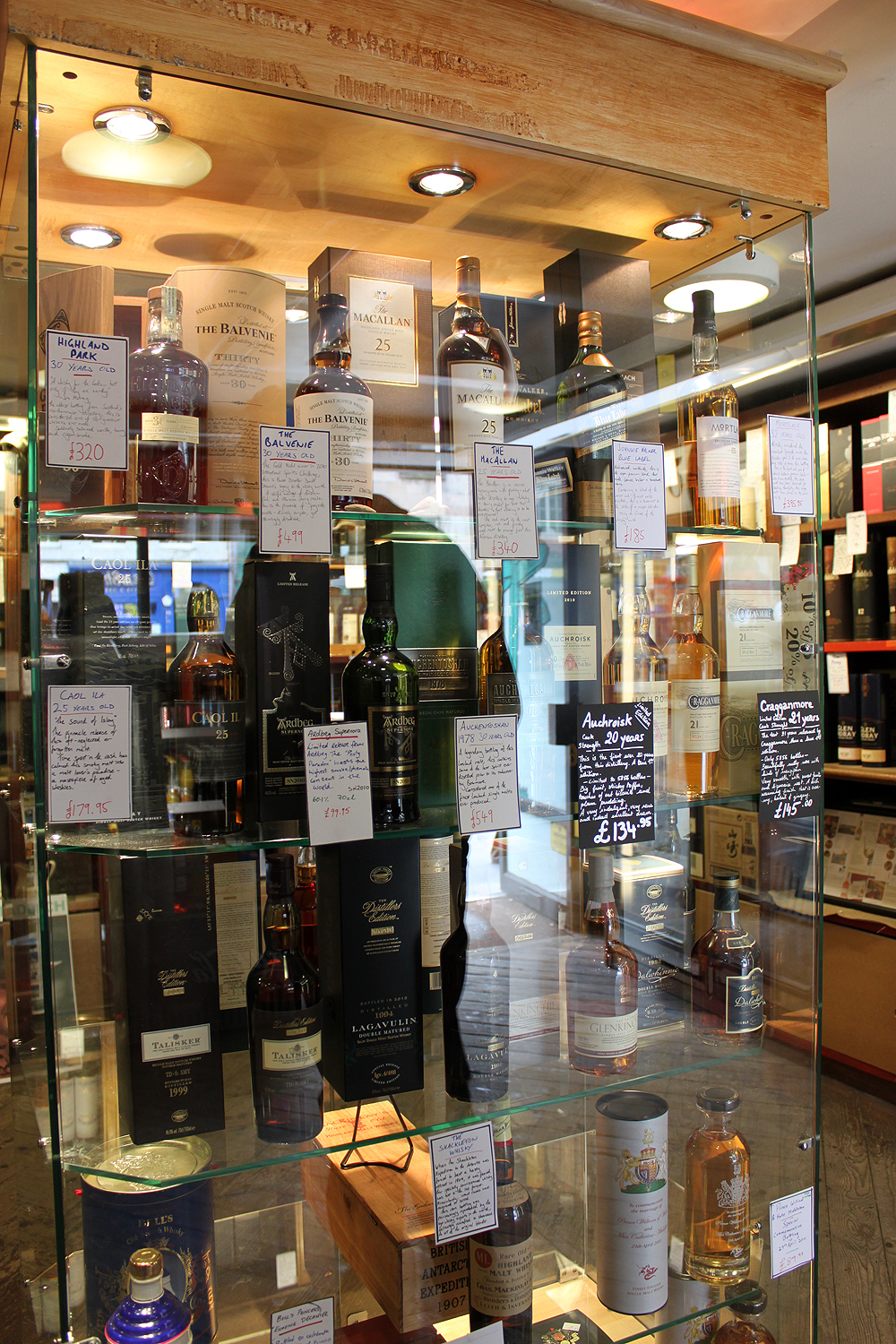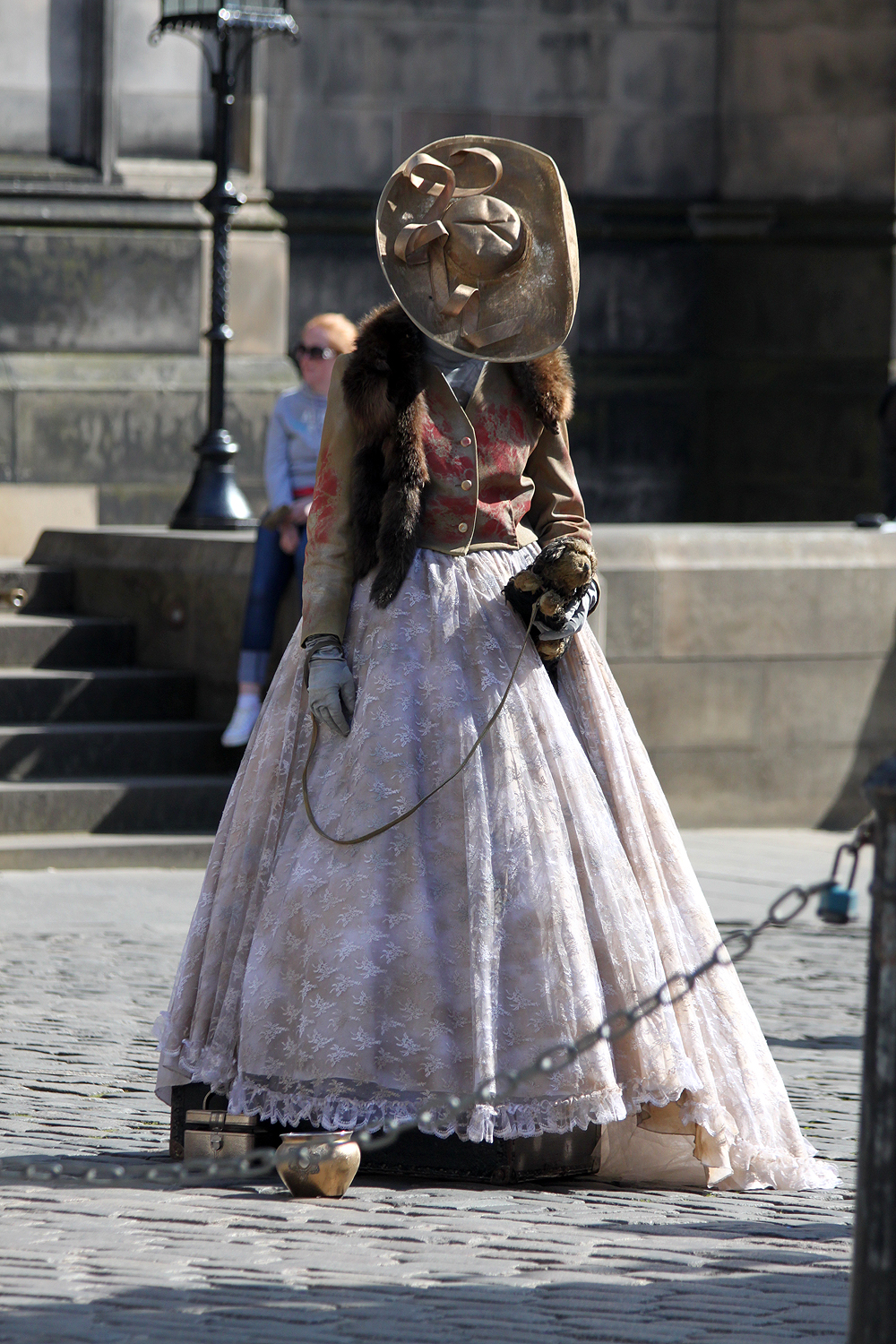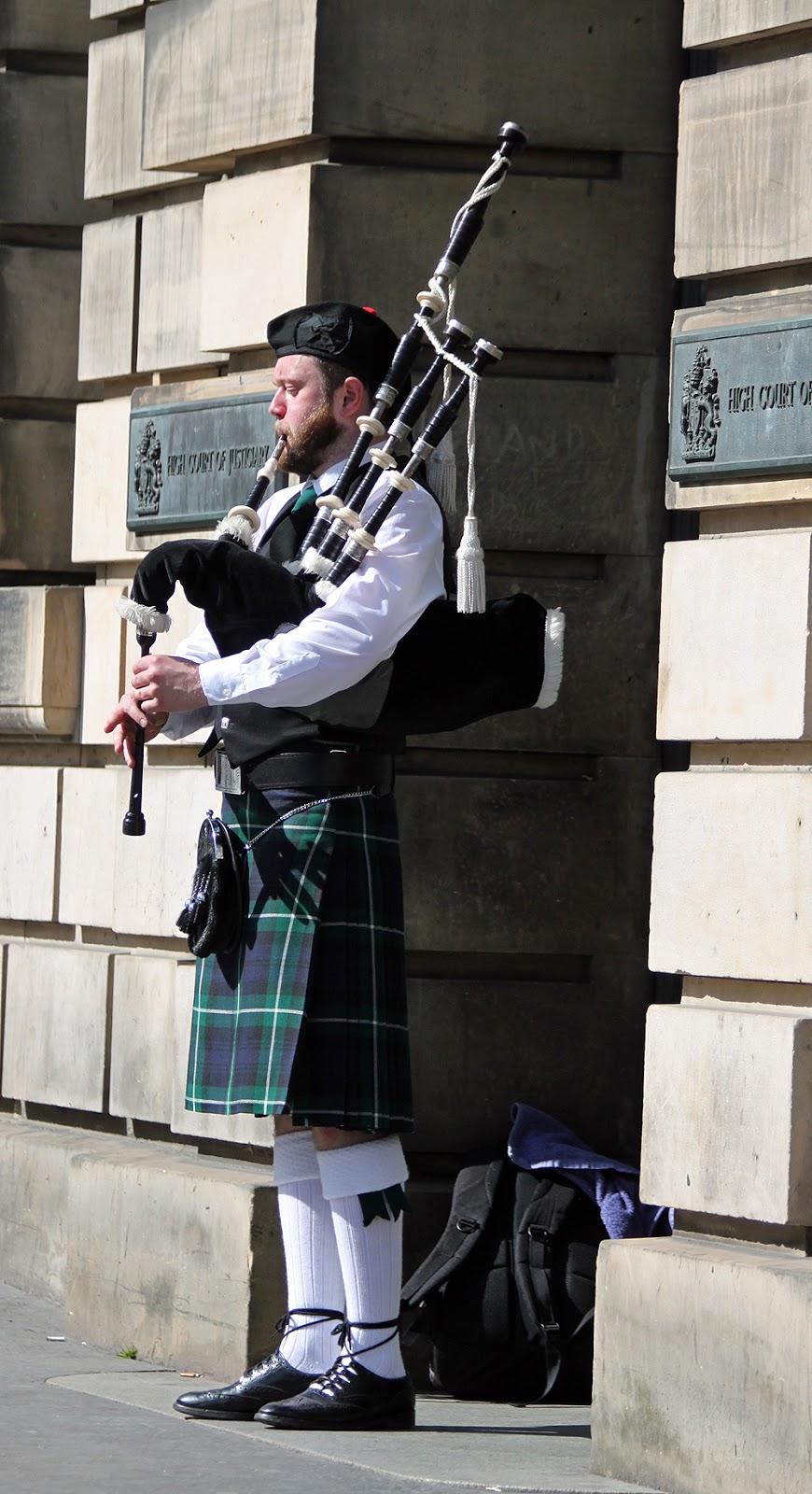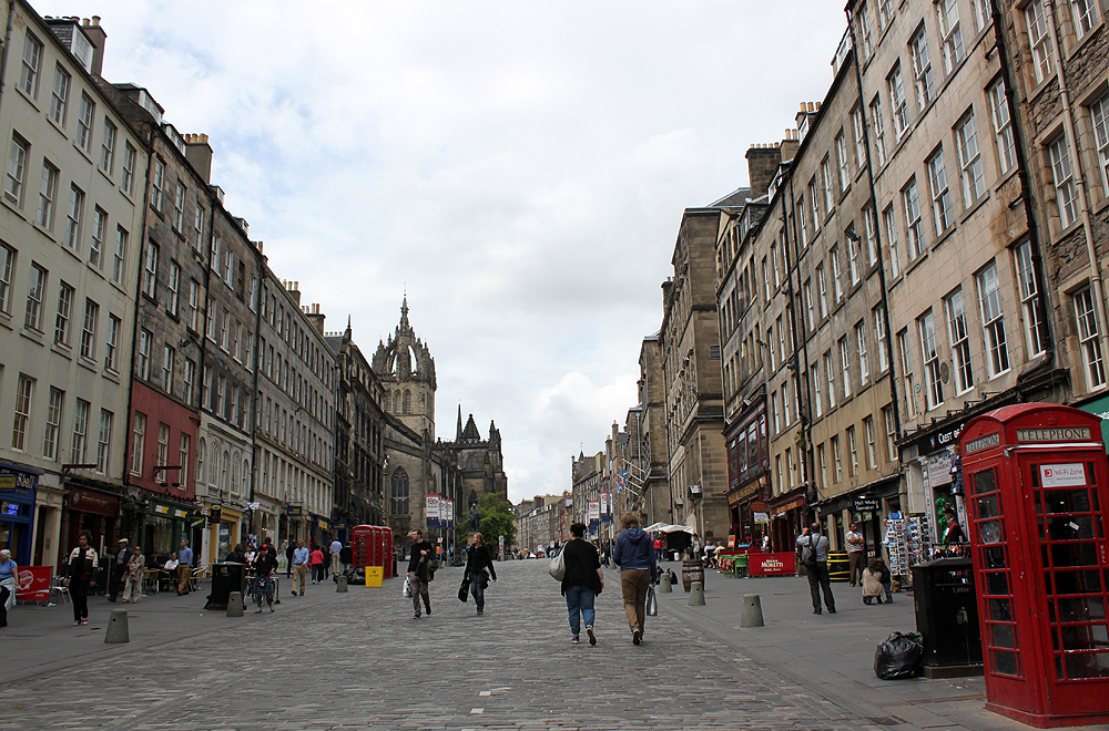 Saavumme leveämmälle High Streetille, jota ympäröivät viisikerroksiset talot. Täällä on paljon liikkeitä, jotka myyvät turistikamaa. Viskikauppoja on myös jonkun verran. Kadun varrella on erilaisia esiintyviä taiteilijoita, jokainen omalla tavallaan lahjakas tai vähintään omaperäinen. Yksin kadulla ei tarvitse liikkua, siitä pitävät huolen muut turistit isompina tai pienempinä ryhminä.