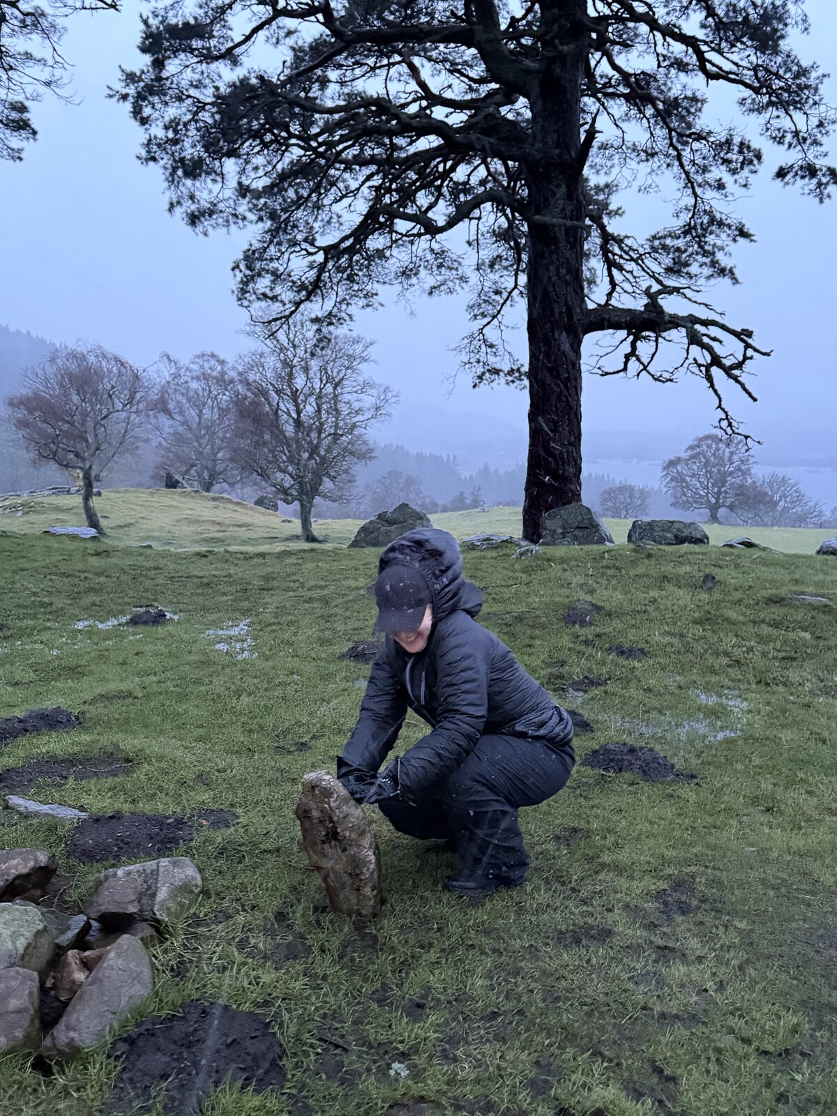 Karja-aitauksen portti oli auki, joten me lähdimme myrskyä ja räntäsadetta uhaten kävelemään noin 200 metrin matkan tien varrelta kukkulalle. Sieltä löytyi pienempi kiviympyrä ja niiden keskeltä pienen pieni pystykivi, jossa nappasimme äkkiä kuvat myrskyn piiskatessa ja juoksimme vaatteet likomärkinä takaisin autolle. Olihan seikkailu!