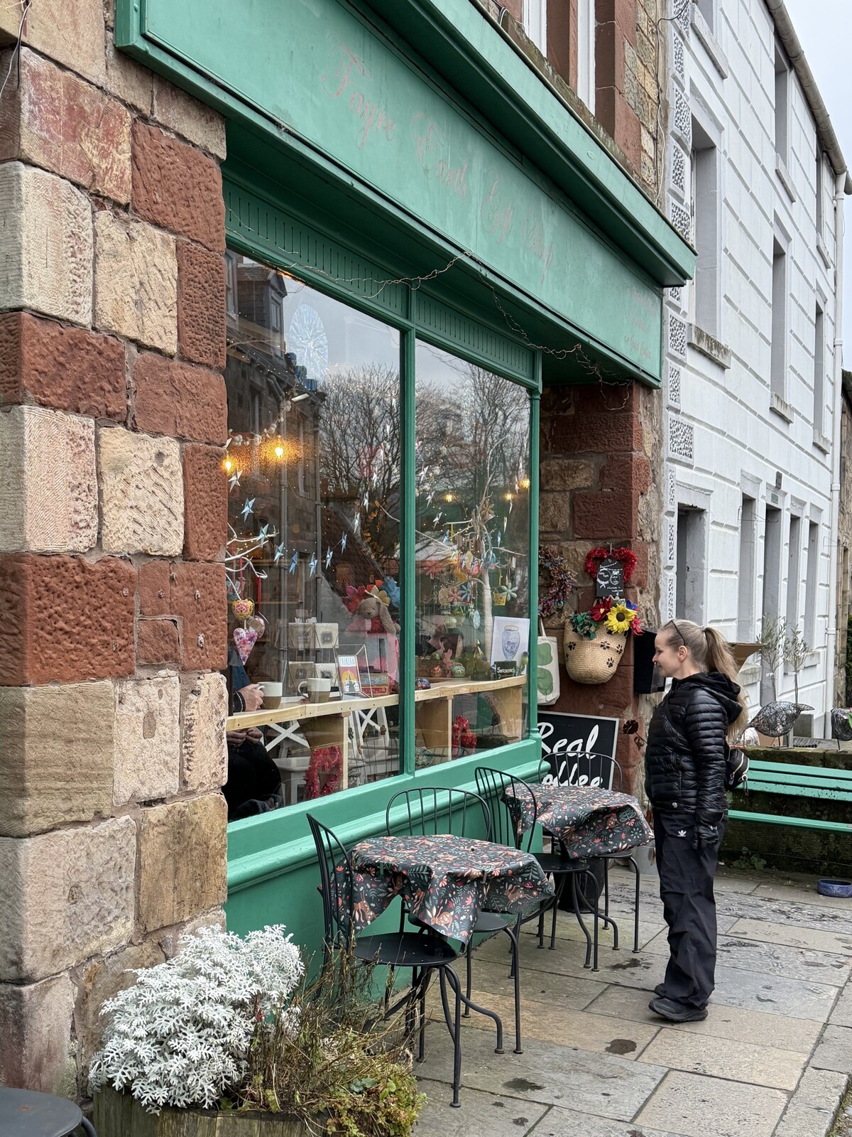 Fayre Earth -lahjatavarakauppa oli se, jonka ikkunasta Claire ihaili sinistä vaasia. Kauppaan menikin seuraavana aamuna autolastillinen Outlander-faneja ja oli selvää, että sarjalla on ollut tälle pienelle kylälle todennäköisesti hyvin mullistava ja toivottavasti myös taloudellisesti myönteinen vaikutus.