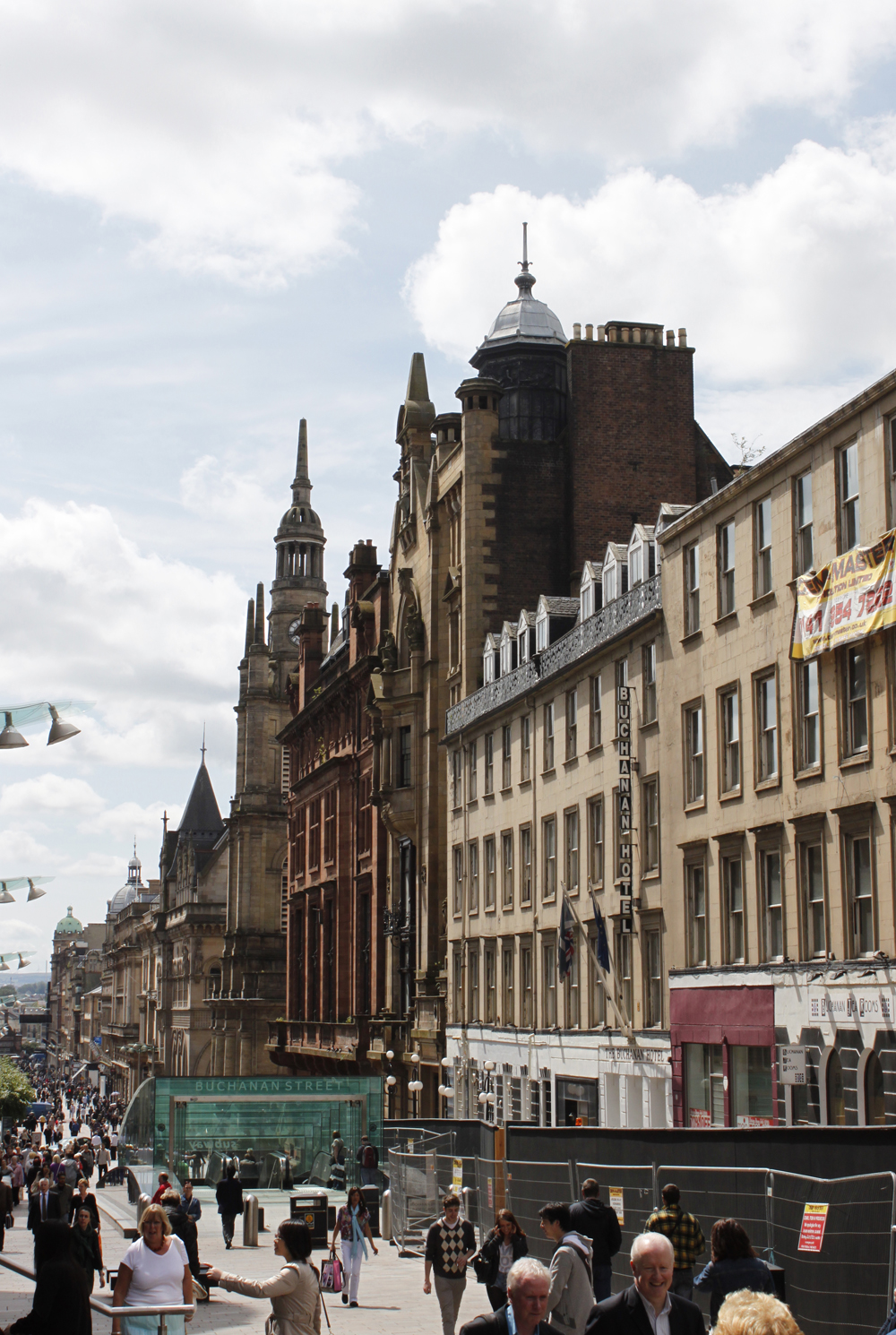 Täältä löytyy kaupungin monipuolisin shoppailuvalikoima. Viihtyisän kävelykadun varrella on runsaasti kauppoja ja Buchanan Galleries -ostoskeskuksesta niitä löytyy paljon lisää. Hyvän viskin ystäville The Whisky Shop on käymisen arvoinen. Build a Bear -liikkeestä voit ostaa täysin omilla toiveilla kustomoidun pehmonallen ja jos nälkä yllättää, kauppakeskuksesta löytyy paljon kahviloita. Kivenheiton päästä löytyy myös Hard Rock Cafe Glasgow. Törmäät todennäköisesti säkkipillin soittajiin ja muihin katutaiteilijoihin tämä kävelykadun varrella. Kannattaa huomioida, että kaupat ovat avoinna pääosin klo 10-19, paitsi torstaisin tunnin pidempään.