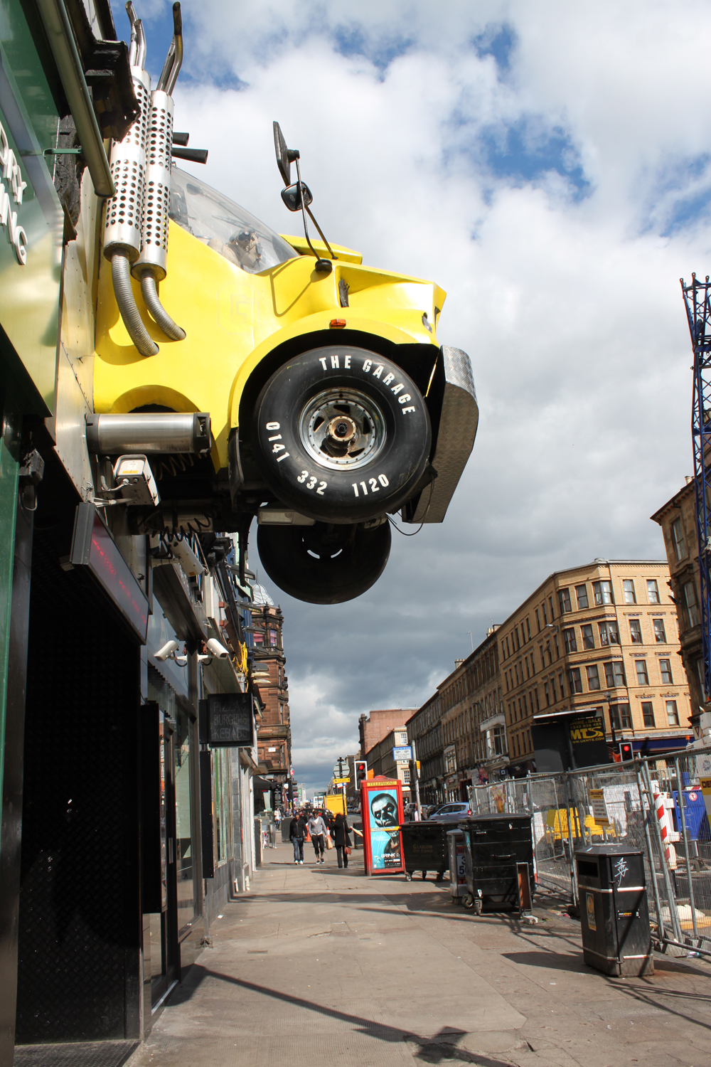 | Sauchiehall Streetin varrelta löytyy useita yökerhoja, joista yksi kuuluisimmista on Garage, jonka tunnistaa keltaisesta rekasta. |
