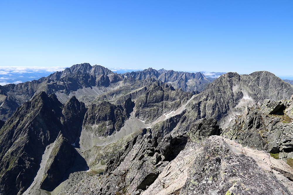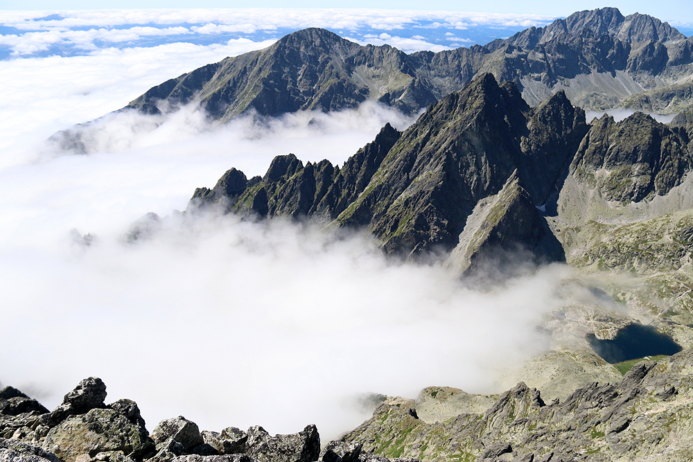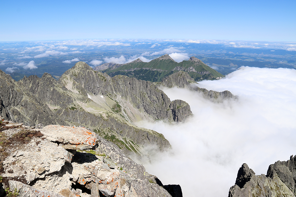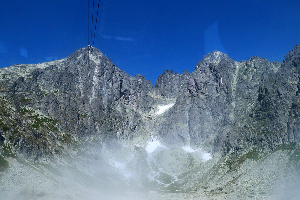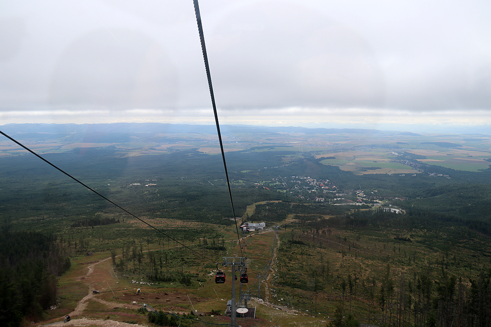Ensimmäiseltä asemalta hissejä meni runsaasti ja samoin ihmisiä niiden kyydissä. Toisella asemalla olimme jo yli kilometrin korkeudessa. Siirtyminen hissistä toiseen oli mutkatonta ja matka ylös sujui ripeästi. Hissien alapuolella kulkeneilla poluilla näkyi vaeltajia. Kolmannella, Skalnaté Pleson asemalla tarkistimme ensin, mistä Lomnický štítille kulkeva hissi lähtee ja se löytyikin hyvien opasteiden ansiosta ravintolarakennuksen toiselta puolelta. Tällä asemalla oli runsaasti väkeä niin ravintolassa kuin sen ympäristössäkin, mutta vain murto-osa heistä pääsisi huipulle saakka.