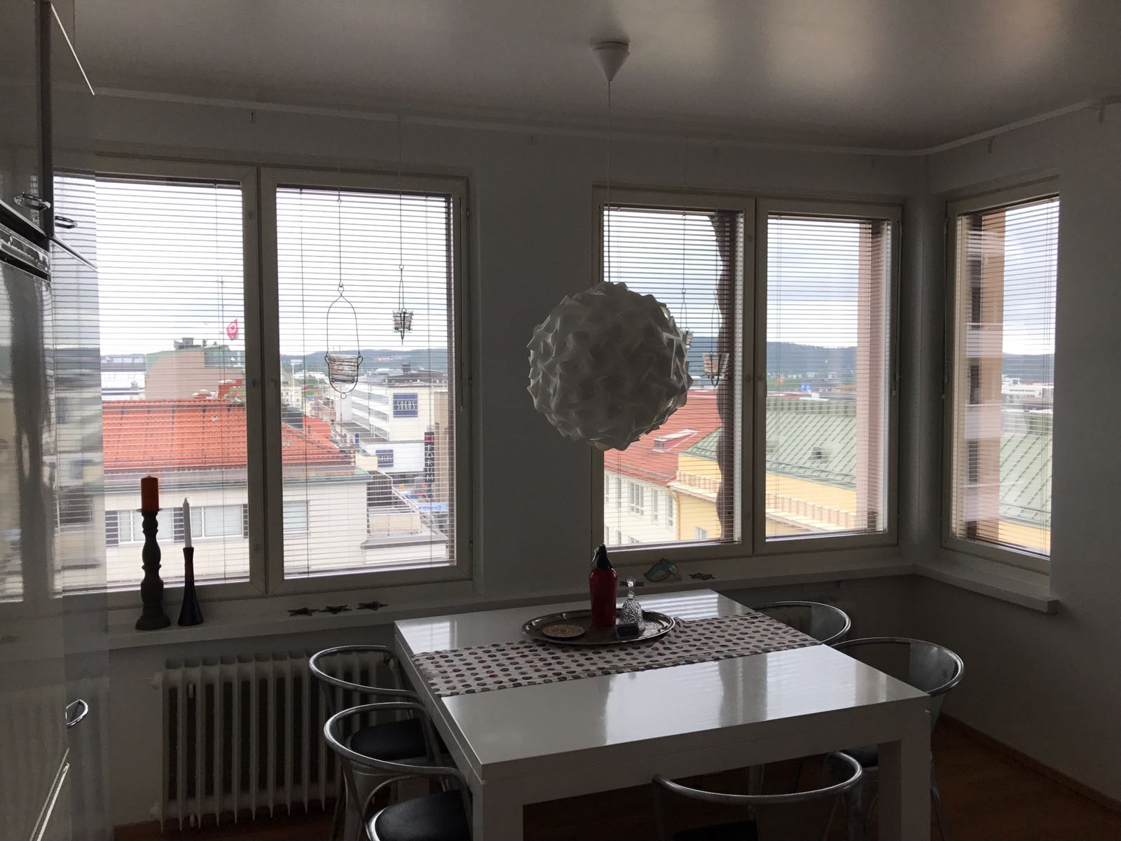Aamulla saimme ihastella kauniita maisemia yli Jyväskylän ja totesimme samalla, että vaikka alhaalla menee paljon liikennettä, ei kattohuoneistoon kuulunut juuri mitään ääniä. Jos siis kaipaat lepoa ja rauhaa Jyväskylän keskustasta, niin tsekkaa myös tämä vaihtoehto. Löytyy muuten myös Airbnb:n kautta.