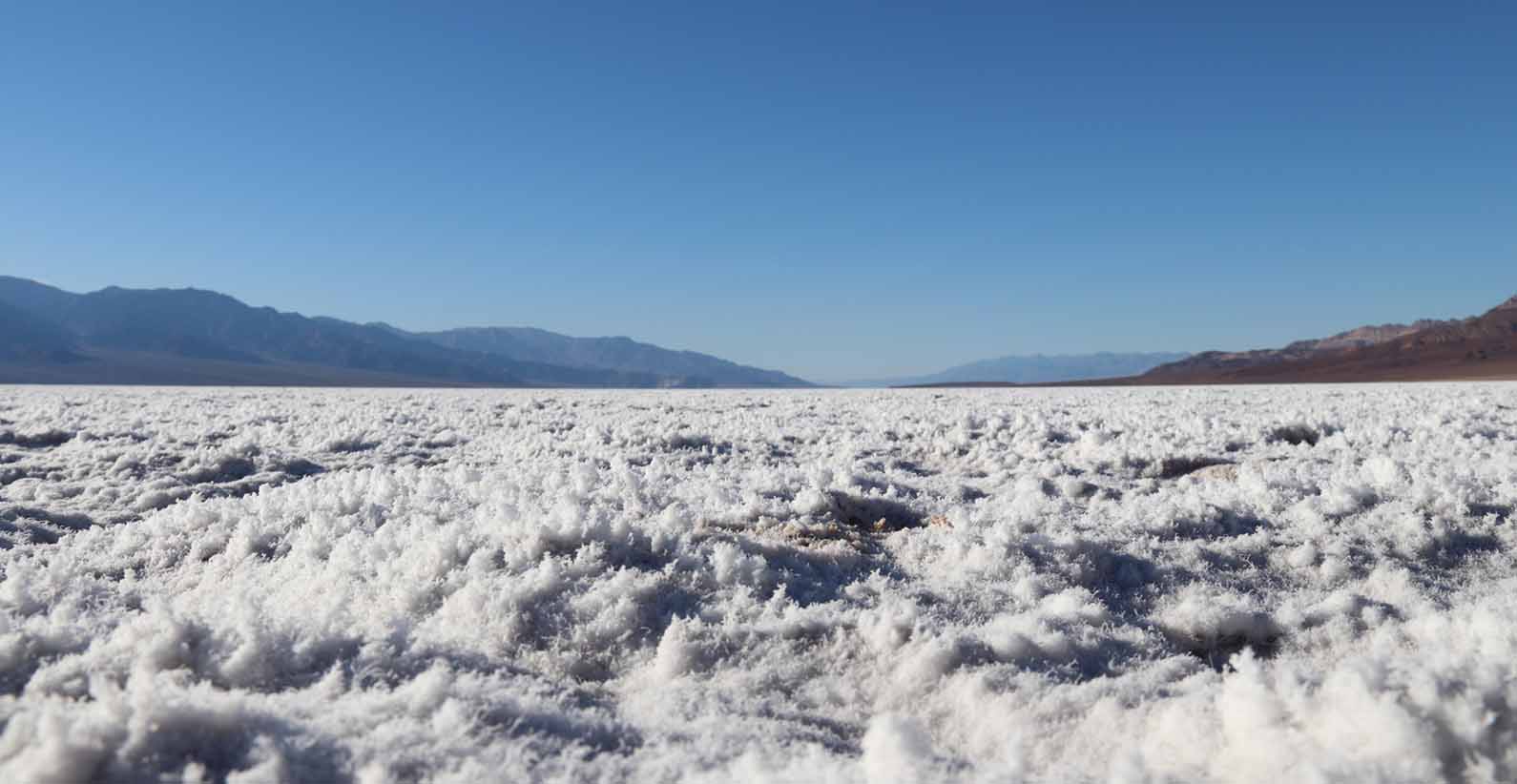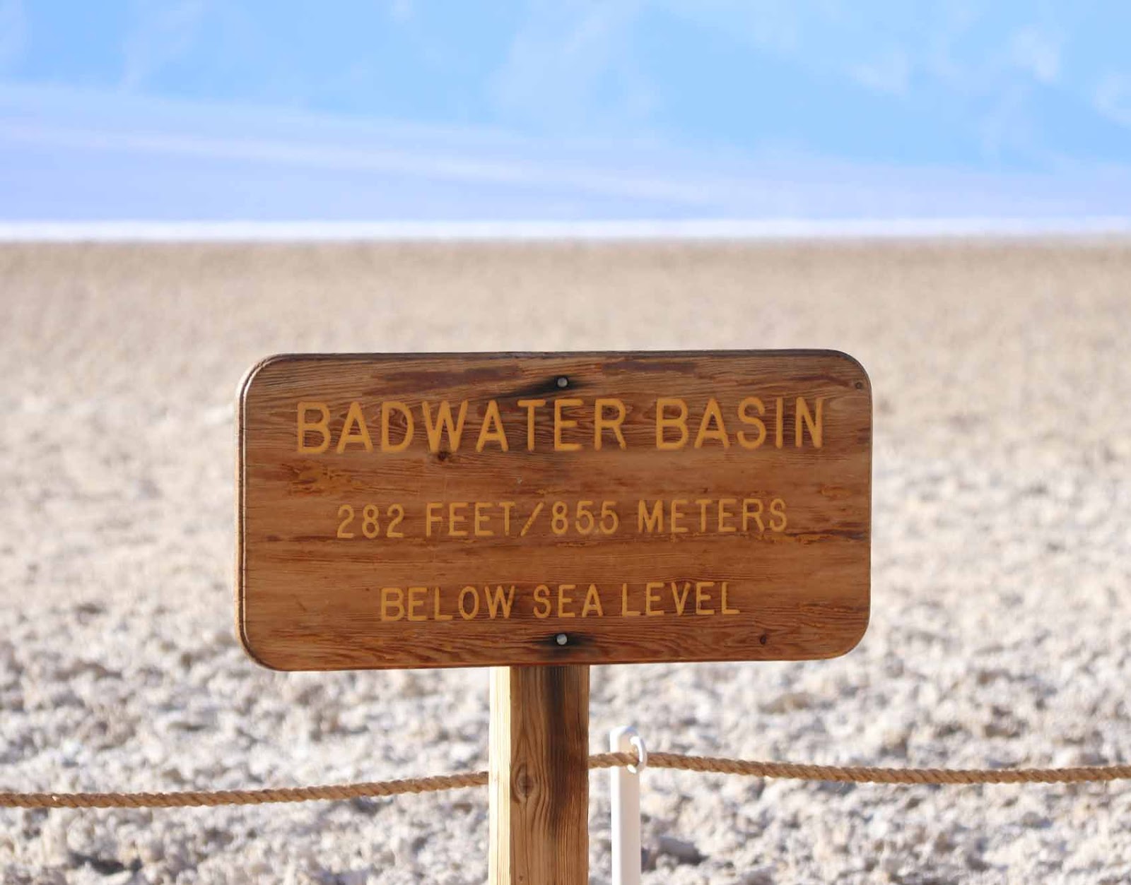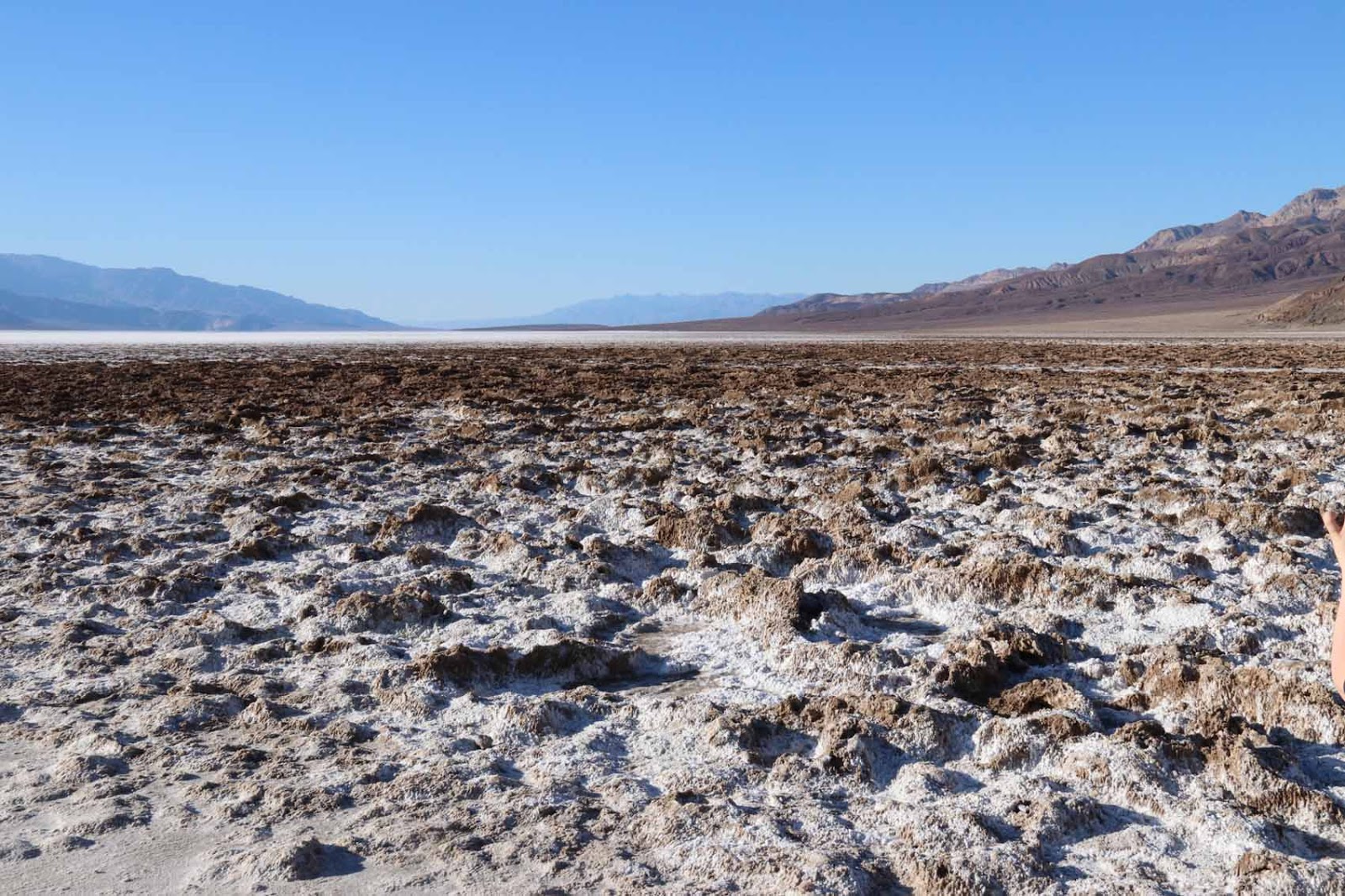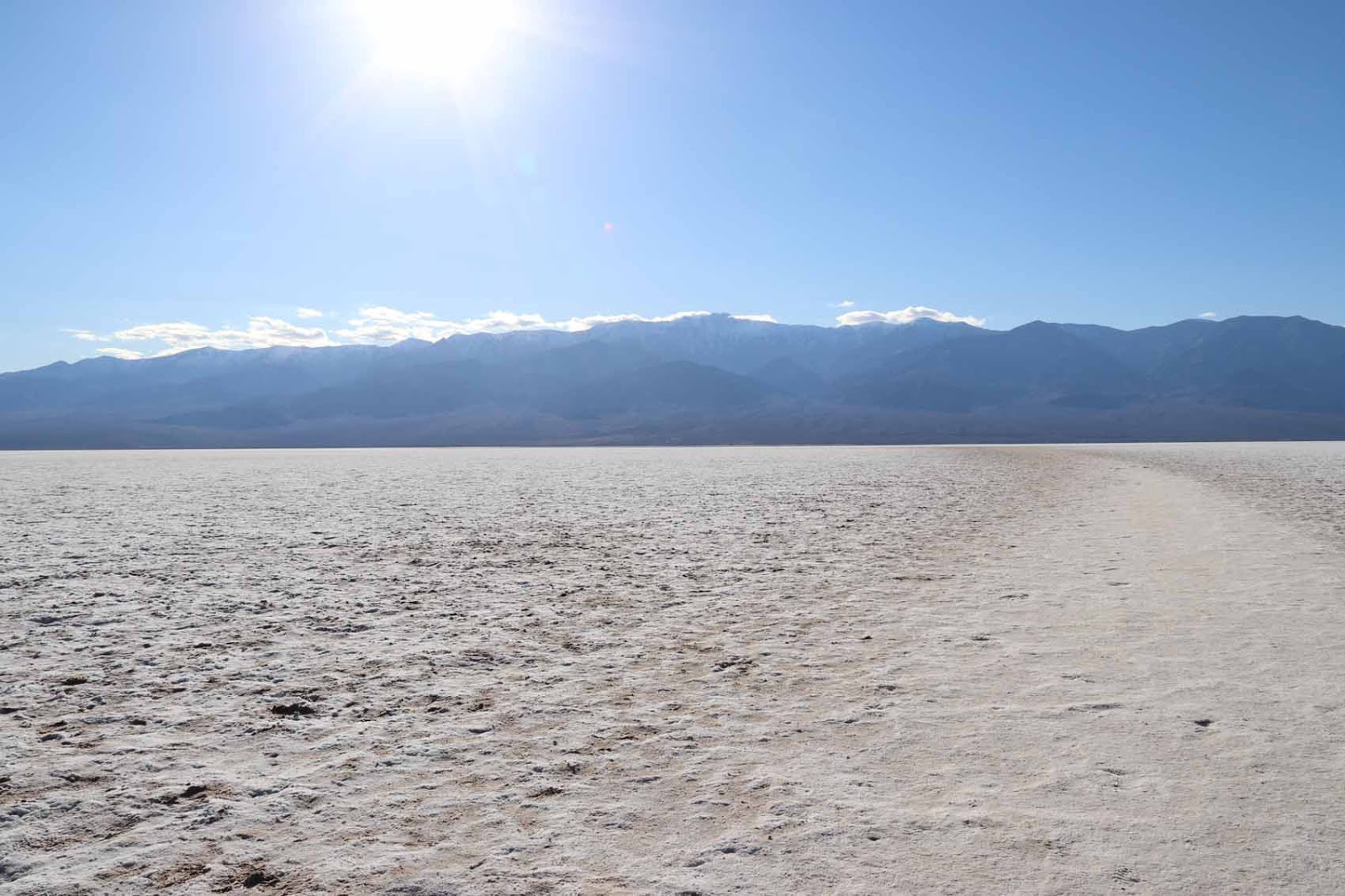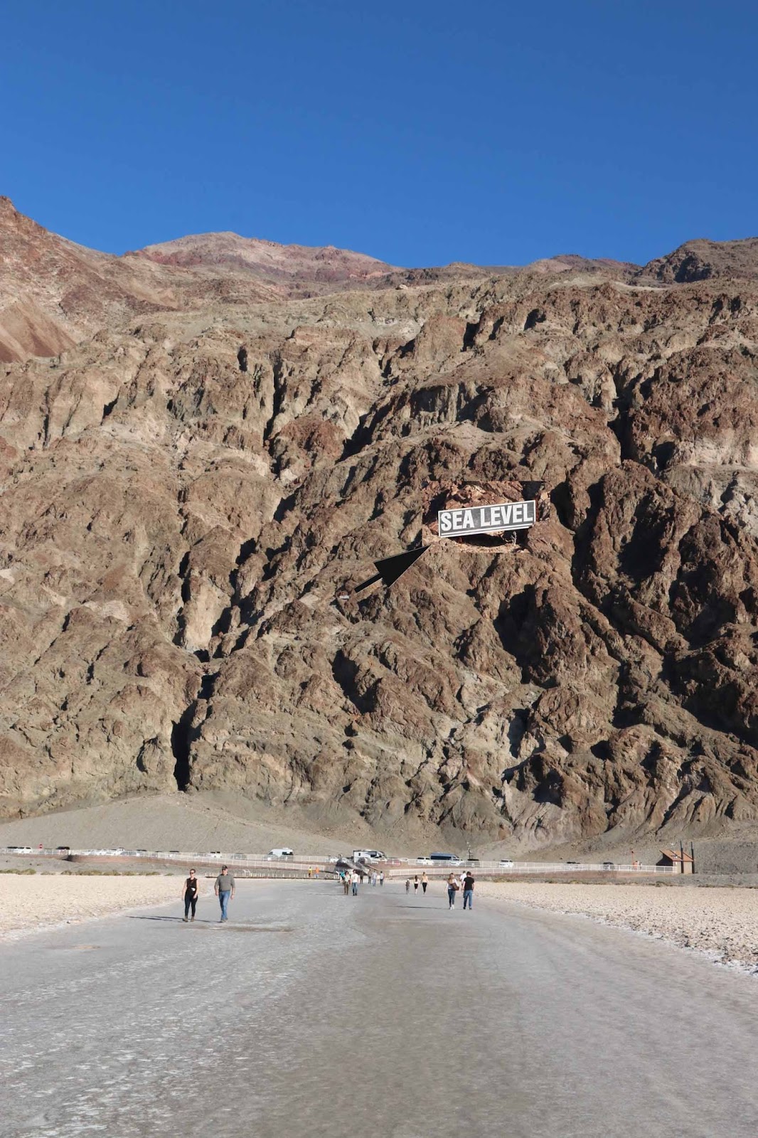 Kuolemanlaakson varsinainen kohokohta on Badwater Basin, joka on Pohjois-Amerikan alin piste. Se sijaitsee 86 metriä merenpinnan alapuolella. Alue oli aavikkolaakson ensimmäinen paikka, jossa törmäsimme isompaan määrään ihmisiä ja autoja sitten Bakerista lähdön. Jätimme auton pienehkölle parkkialueella ja parkkipaikan vierestä löytyi myös wc. Tarkista mennessäsi pysäköintimaksun tarve.