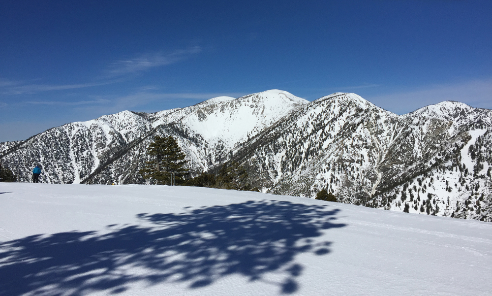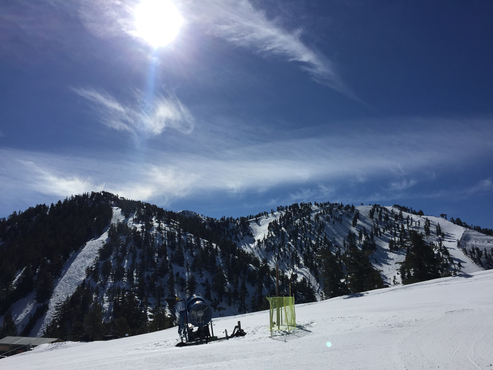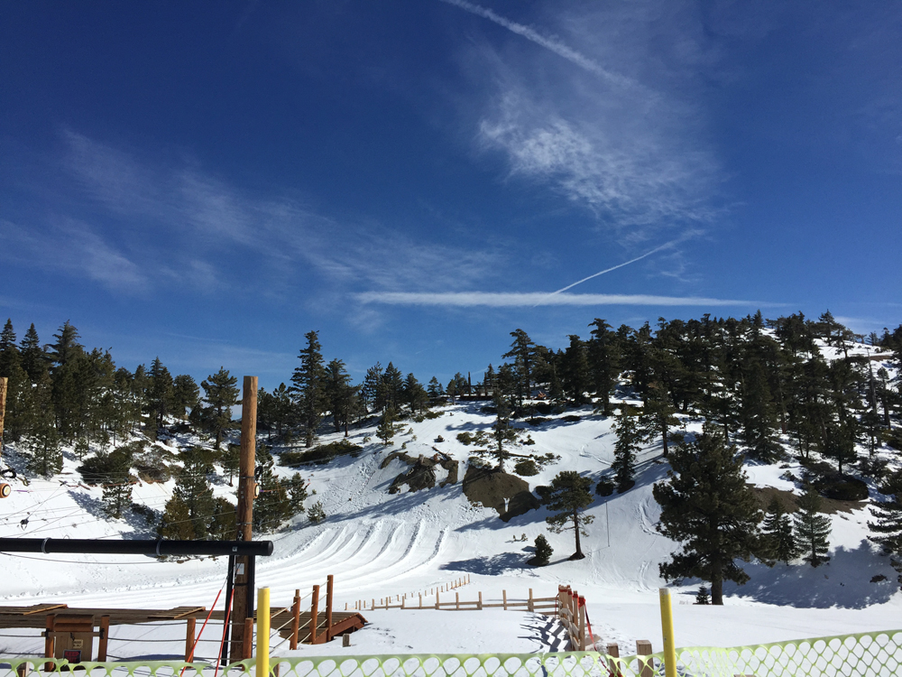 Hissistä poistuessani eteeni avautuivat kertakaikkisen upeat maisemat. Los Angeles näkyi hienosti vuorien välistä ja mielessäni arvuuttelin, mikä huipuista on korkein Mt. Baldy. Lähdin laskettelemaan alas maisemareittiä, jonka varrella oli jonkun verran kiviä. Reitti oli tampattu vuoren reunamalle ja vaikka se oli useamman metrin leveä, en uskaltanut laskea valtavan kovaa, sillä pudotus vieressä oli aika jyrkkä. Ylhäällä tuuli voimakkaasti, joten alas laskettuani päätin kokeilla viereisen rinteen hissiä, mutta sitä ennen oli lyhyen tauon paikka. Kauhukseni huomasin, ettei laskettelukeskuksessa ollut verkkoa ja arvasin, että Ilkka odotteli tietoa perille pääsystäni kuumeisesti. Onneksi kahvilasta löytyi wifi ja sain viestittyä, että olen päässyt perille ja kaikki on hyvin.