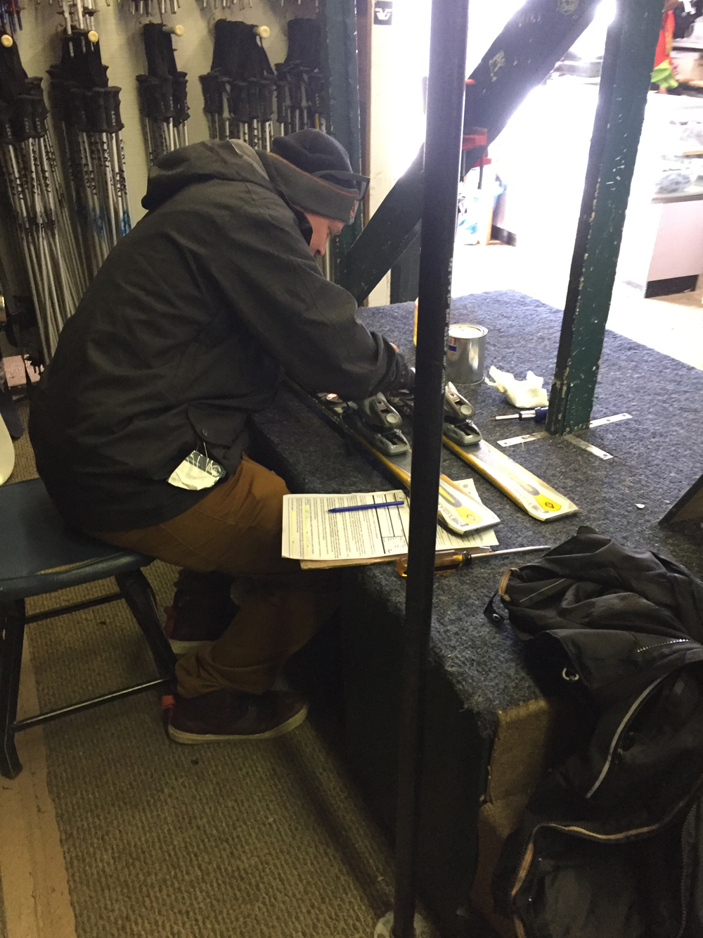 Viimein hissi oli perillä ja ylhäällä aukeni luminen, aurinkoinen, upea vuoristomaisema. Harvojen rakennusten joukosta oli helppoa löytää suksivuokraamo, johon suuntasin ensimmäisenä. En tietenkään ollut etukäteen tarkistanut, mikä pituuteni ja painoni on yhdysvaltalaisen mitta- ja massayksiköiden mukaan, mutta ne selvisivät onneksi avuliaan asiakaspalvelijan kanssa. Suksien siteitä säädettiin pitkään ja hartaasti, jonka jälkeen pääsin rinteeseen. Sain neuvoksi laskea yhden mäen alas, josta pääsen seuraavaan hissiin. Tarkistin vielä taskussani olevasta kartasta, mikä rinne olisi missäkin päin ja suuntasin suoraan korkeimmalle huipulle.