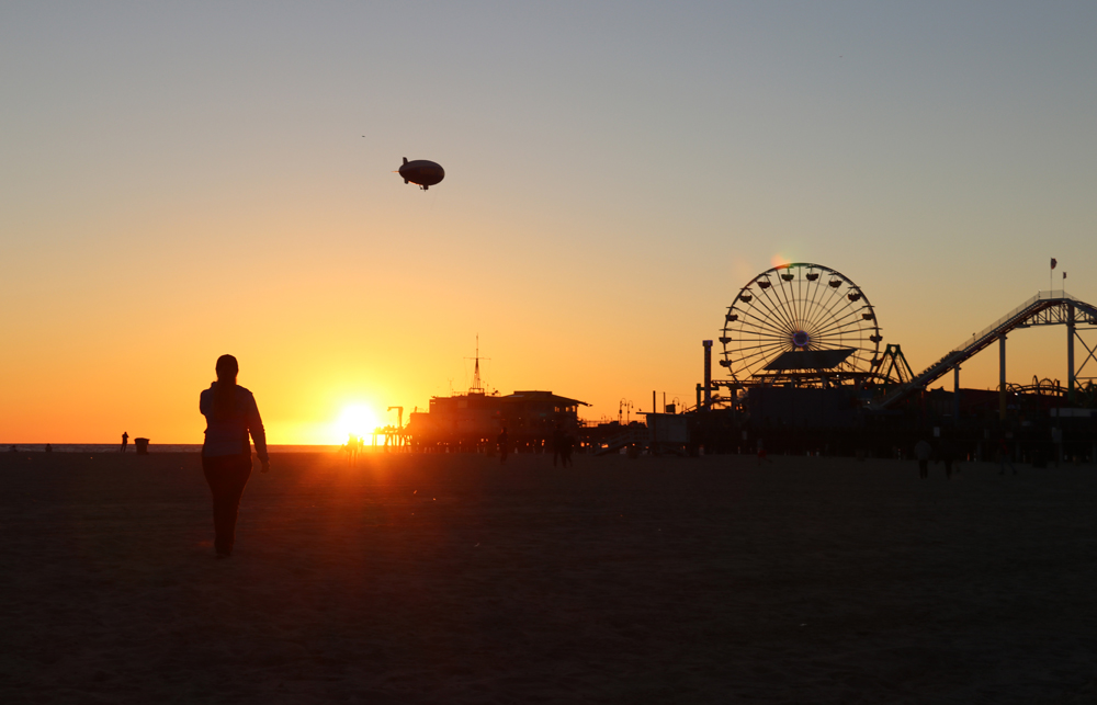 Pääsin noin tunnissa takaisin majapaikkaamme, jossa Ilkka odottelikin jo vietettyään päivän Hollywood-leskenä. Pienen virkistäytymisen jälkeen hyppäsimme autoon ja otimme suunnaksi Santa Monican. Los Angeleshan on tunnettu siitä, että voit saman päivän aikana lasketella ja viettää rantaelämää. Ihan bikinikeleihin sää ei taipunut meidän lomalla, mutta jos kengät ja sukat ovat päivän päätteeksi täynnä hiekkaa, niin se lasketaan rantalomaksi, eikös vaan? Ehdimme juuri ja juuri fiilistelemään auringonlaskua tuolla upealla rannalla. Paljon tuli ajettua päivän aikana autolla, mutta se oli jokaisen kilometrin arvoista.